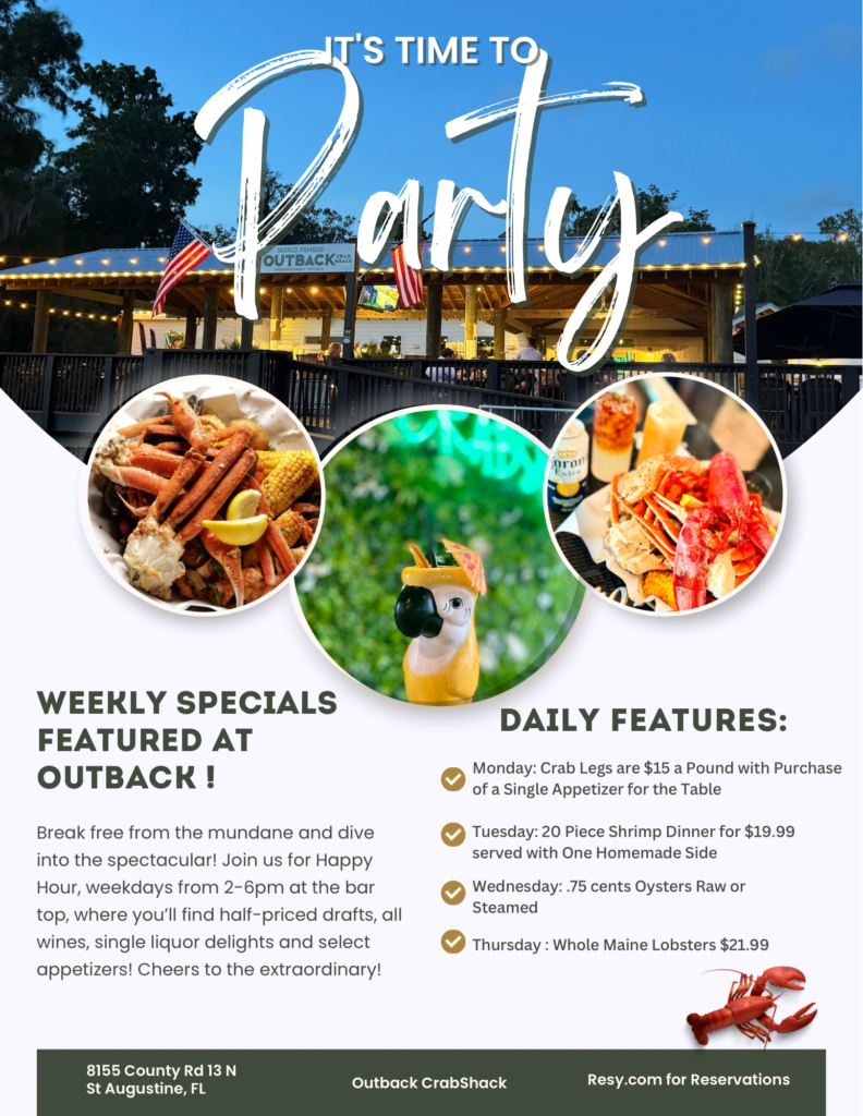 Nestled on the picturesque Six Mile Creek, just off the St. Johns River, Outback Crab Shack has been a cherished dining destination in St. Augustine since its original opening in 1984. Known for its fresh seafood and unique riverfront location, our restaurant quickly became a favorite for locals and tourists alike.